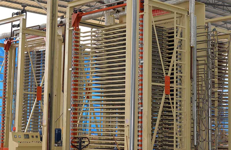 6:熱壓成型處理:經(jīng)過涂膠鋪設(shè)好的模板層,通過熱壓工藝進行壓平。傳統(tǒng)的加熱時采用了鍋爐水傳到熱進行加熱,現(xiàn)代化設(shè)備室采用了電加熱,壓平后,可以增加建筑模板的密實度,成型比較規(guī)則,提高了模板的使用質(zhì)量。采用先預(yù)壓再熱壓的工藝,大程度降低坯板錯位的幾率,再施以合理的壓力和溫度熱壓,保證了每一張建筑模板均有好的膠合強度和硬度。